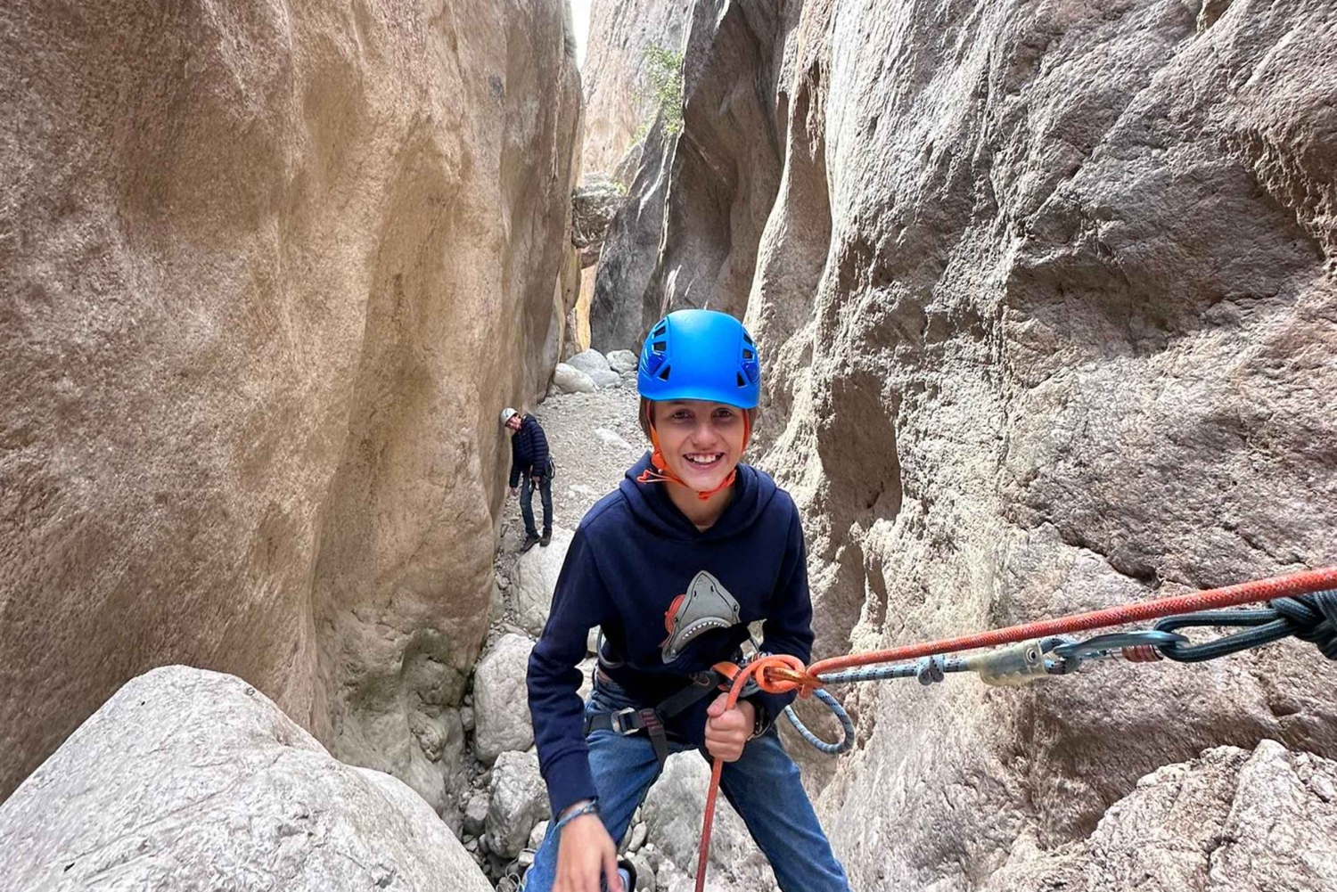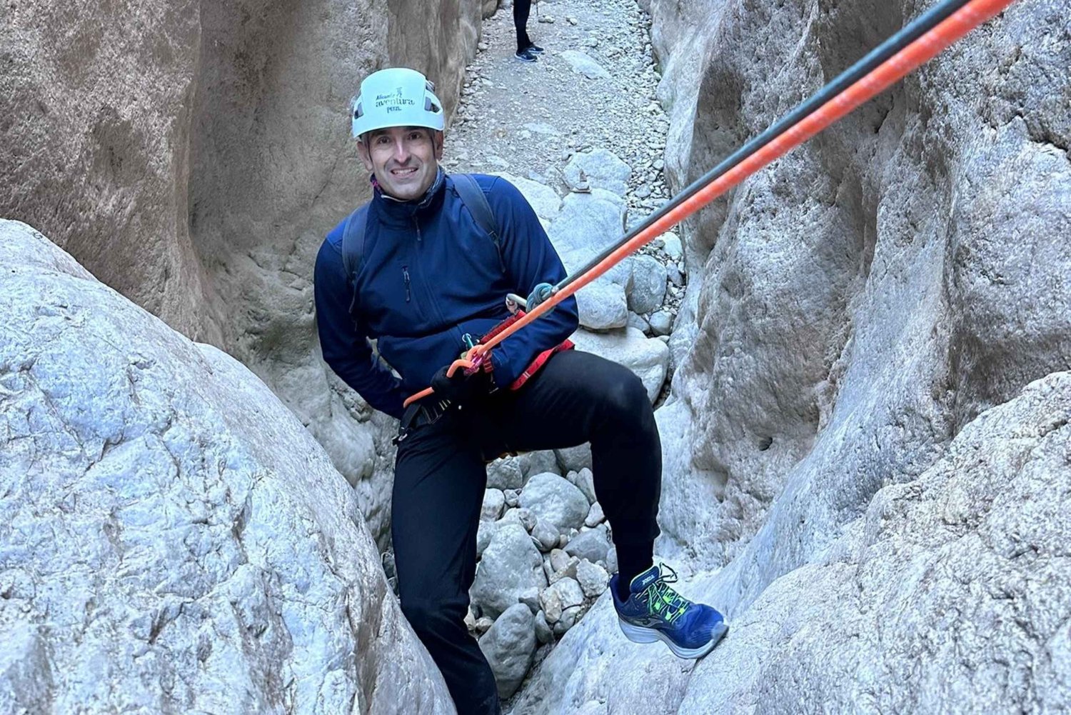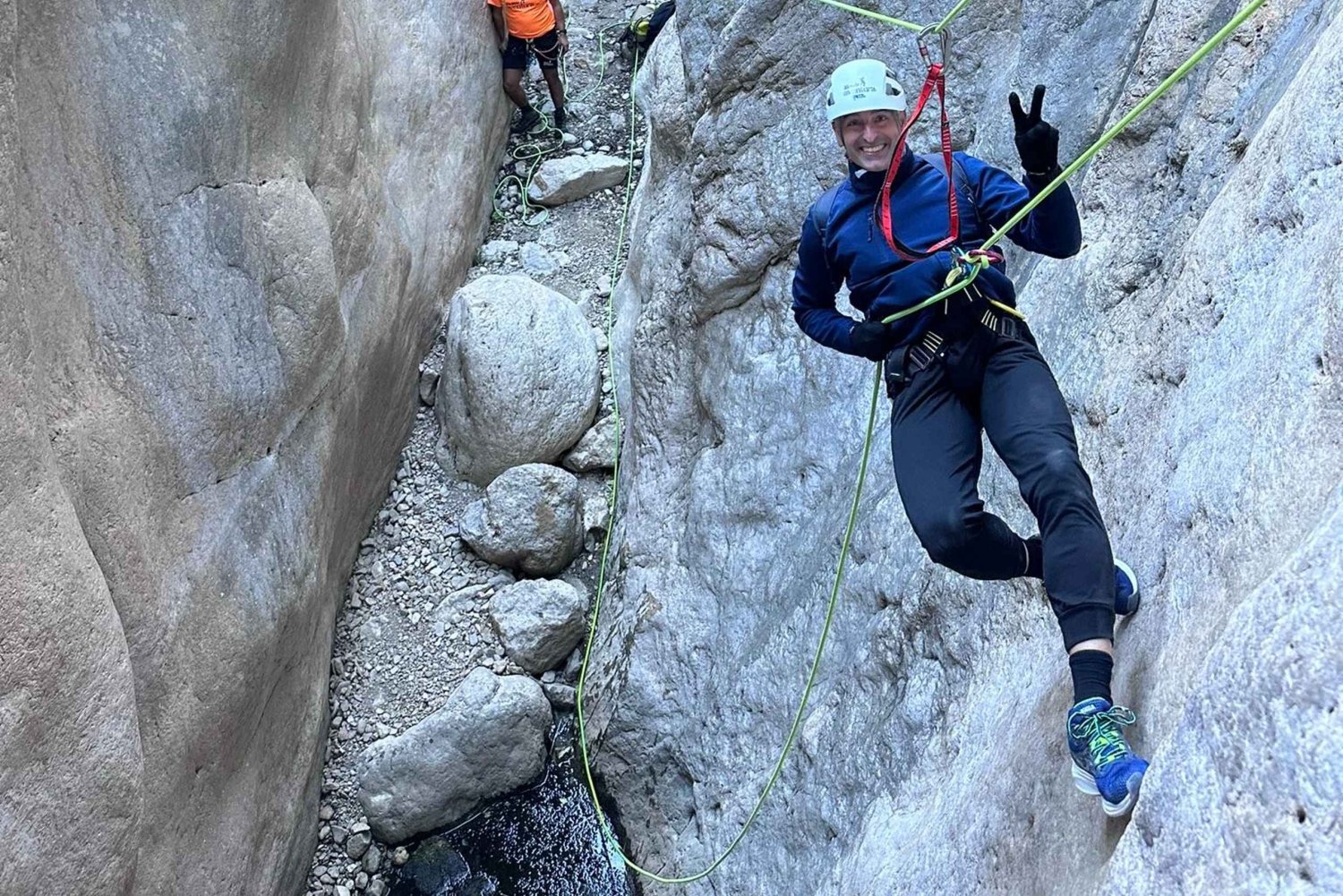 Marchez entre un abîme de majestueuses parois de pierre de cent mètres de haut dans cet étroit canyon très proche de la mer, une option intéressante pour ceux qui aiment le canyoning, plein de rappels et de mains courantes.